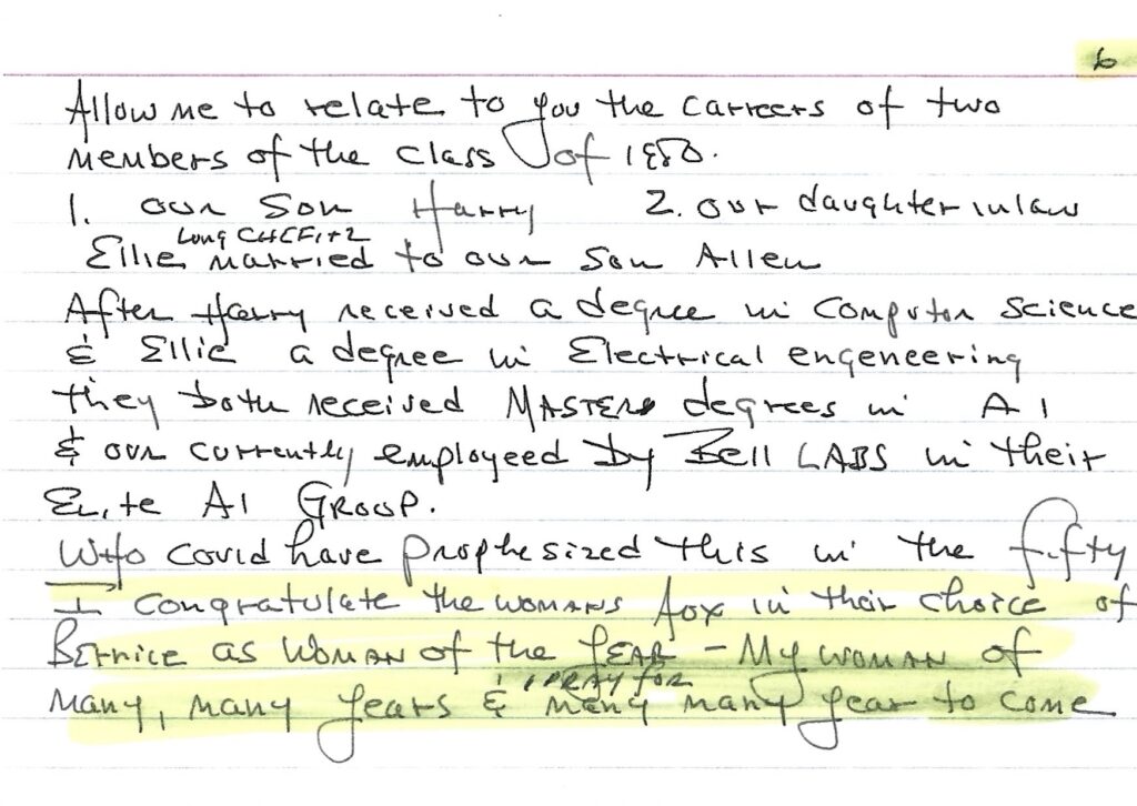 At the dinner, Bernice was introduced by her husband, Mel. His handwritten notecards still exist.